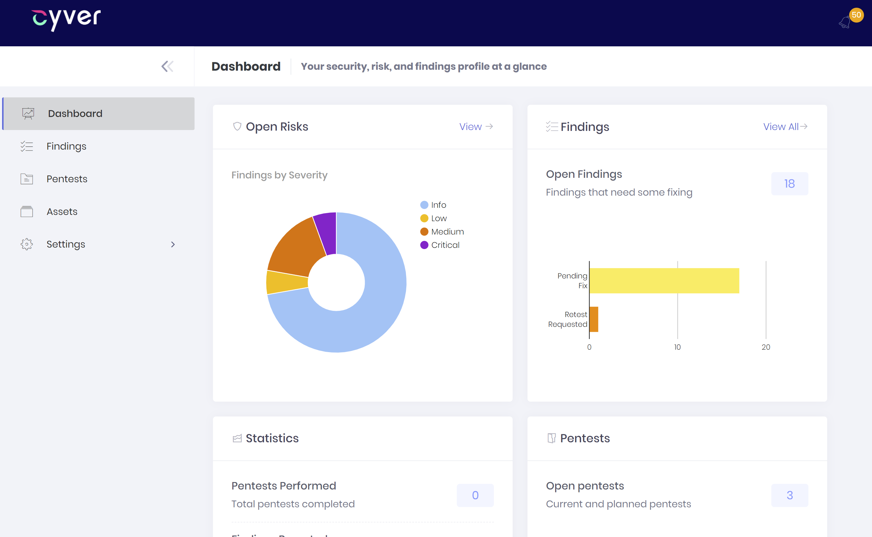 Cyver makes it easy to integrate pentesting into Agile & DevOps cycles, with simple, schedulable, & cloud-based Pentest-as-a-Service. Approve pentest budgets & deliver credits to DevOps & IT teams. Schedule ongoing pentests. And, maintain a cybersecurity profile, with findings management, simple re-testing, & metrics to track vulnerabilities over time.